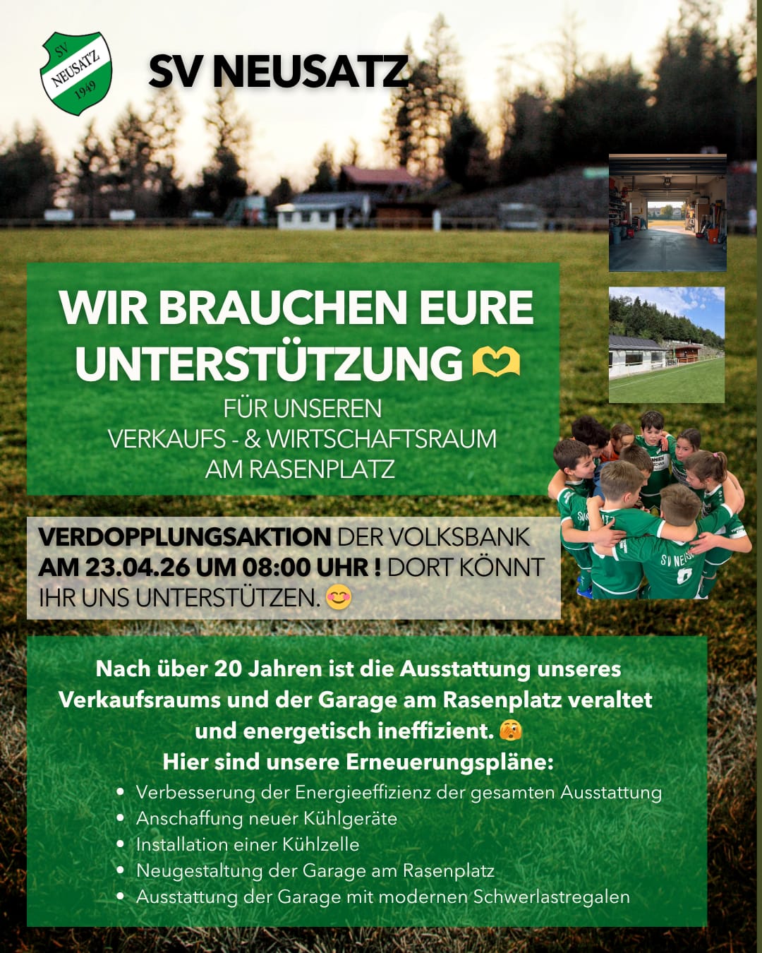 Spendenaktion – Liebe zur Region: Wir rufen die Gemeinschaft zur Unterstützung unserer lokalen Spendenaktion für den SV Neusatz Fußballverein auf. Mit eurer Hilfe wird unser Clubhaus- und Wirtschaftsraum zukunftsfähig aufgestellt und die Region gestärkt. Jeder Beitrag zählt und kommt direkt der Modernisierung zugute.